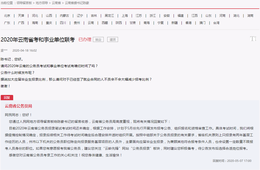 受疫情影響,2020年各類考試都推遲進行,在就業(yè)嚴峻的情況下,眾多考生非常關(guān)注2020云南省考何時開始。近日,在“人民網(wǎng)領(lǐng)導(dǎo)留言板”欄目中云南省公務(wù)員局就何時開展2020省考進行了答復(fù),具體內(nèi)容如下: