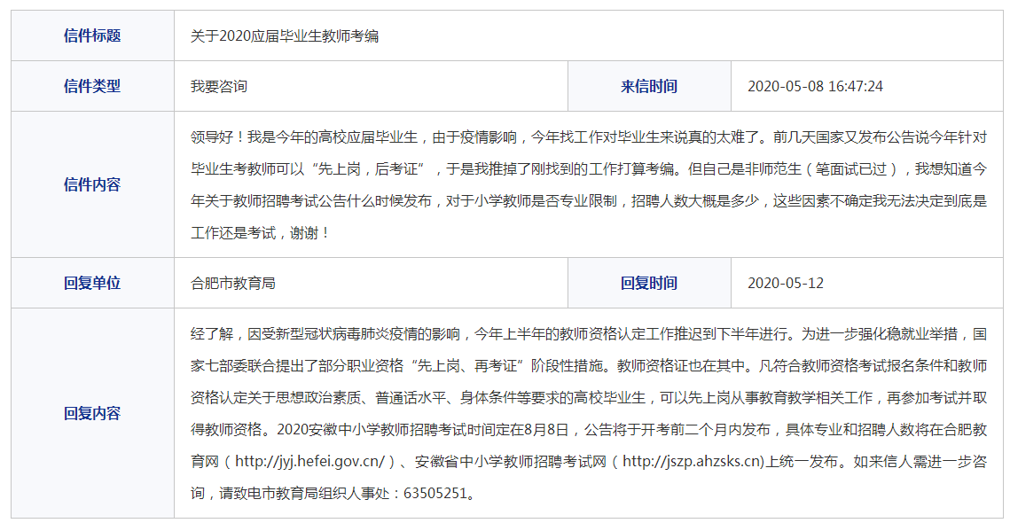 合肥市教育局回復(fù):2020安徽教師招聘考試公告預(yù)計(jì)6月份發(fā)布!