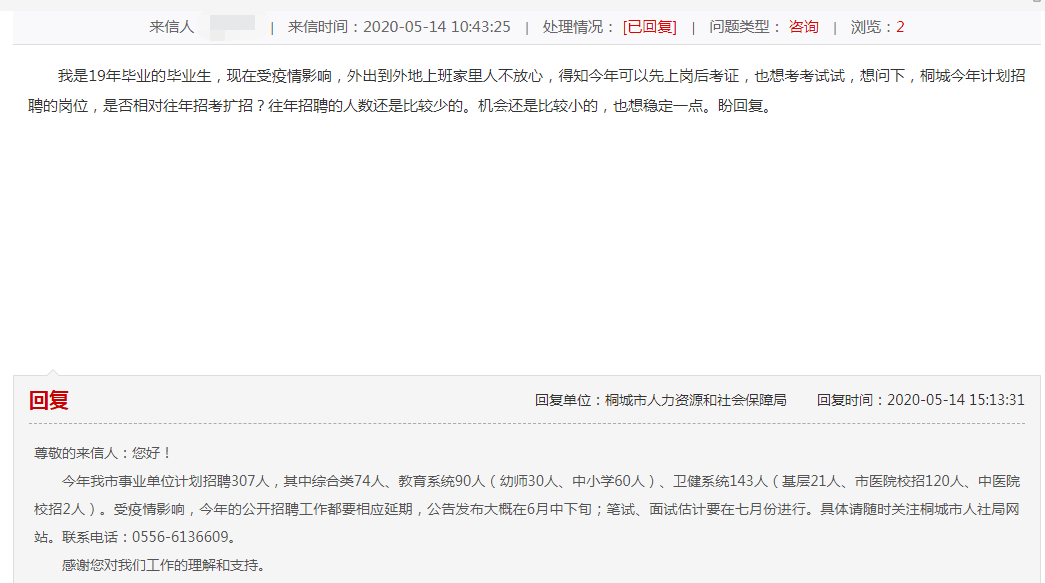 5月14日考生向桐城人社局提問事業(yè)單位招聘情況,以下是詳細內容: