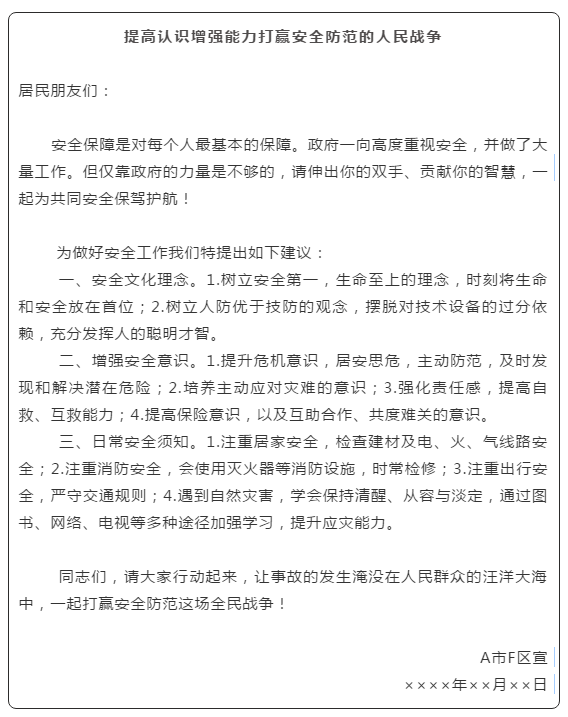 結(jié)語(yǔ):這個(gè)段落主要起號(hào)召作用。當(dāng)交代完所要宣傳的內(nèi)容以后,就要號(hào)召宣傳對(duì)象來落實(shí)踐行所宣傳的內(nèi)容,這樣的話,宣傳稿才算完整。