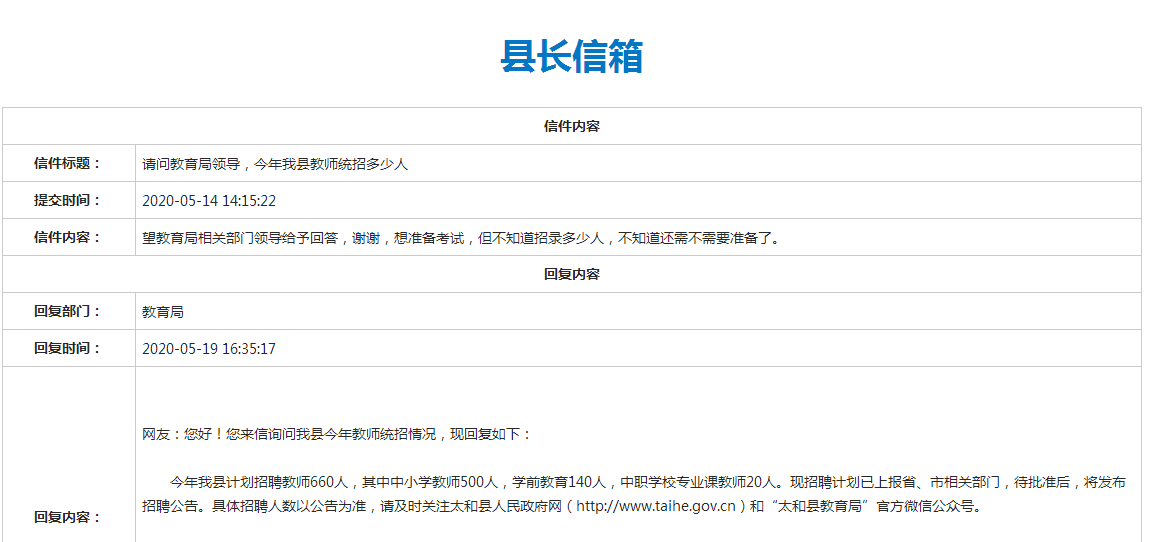 網(wǎng)友:您好!您來信詢問我縣今年教師統(tǒng)招情況,現(xiàn)回復(fù)如下: