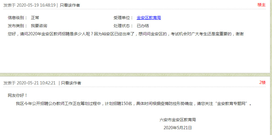 我區(qū)今年公開招聘公辦教師工作正在籌劃過程中,計(jì)劃招聘150名,具體時(shí)間根據(jù)疫情防控形勢(shì)確定,請(qǐng)您關(guān)注“金安教育專題網(wǎng)”。