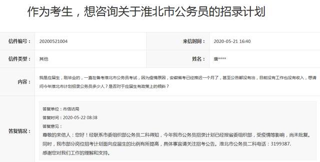 信件內(nèi)容:我是應(yīng)屆生,剛畢業(yè)的,一直在備考淮北市公務(wù)員考試,因?yàn)橐咔樵?,安徽省考已?jīng)推遲一個(gè)月了,甚至公告都沒(méi)有出,目前沒(méi)有工作也沒(méi)有收入,想請(qǐng)問(wèn)今年淮北市計(jì)劃招錄公務(wù)員多少人?是否對(duì)于應(yīng)屆生有政策上的傾斜?