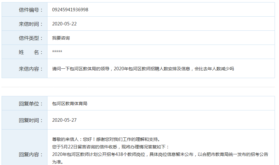 回復(fù)內(nèi)容:尊敬的來信人:您好!感謝您對我們工作的理解和支持。您于5月22日留言咨詢的信件收悉,現(xiàn)將辦理情況答復(fù)如下:2020年包河區(qū)教師計劃公開招考438個教師崗位,具體崗位信息暫未公布,以合肥市教育局統(tǒng)一發(fā)布的招考公告為準。