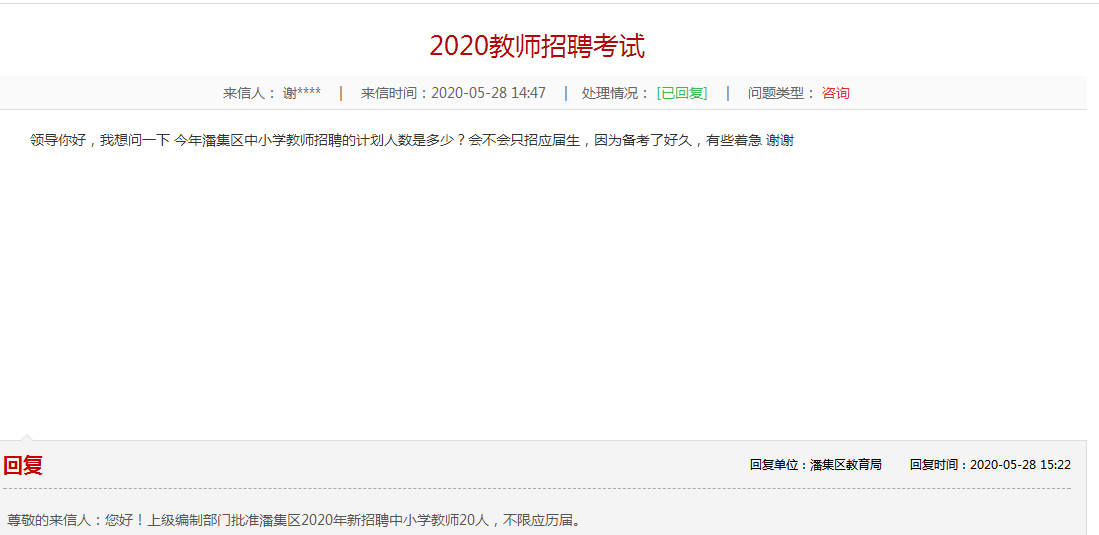 尊敬的來信人:您好!上級(jí)編制部門批準(zhǔn)潘集區(qū)2020年新招聘中小學(xué)教師20人,不限應(yīng)歷屆。
