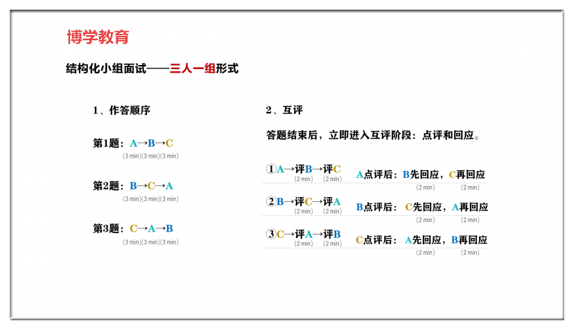 (1)結(jié)構(gòu)化小組互評:15分鐘場外備考看題,進(jìn)入考場后,按要求每人依次答題,每道題目3分鐘(注:個人答題時間:2020年—2021年均為3分鐘,2018年—2019年均為2分鐘);全部答題結(jié)束,按要求展開互評,點評每人的時間為2分鐘;被點評人針對點評展開回應(yīng),時間2分鐘。