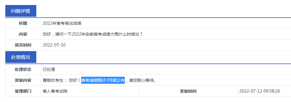 2022安徽省考筆試于7月9日-10日結(jié)束,相信很多小伙伴都比較關(guān)心公布成績(jī)的消息,以下是安徽博學(xué)教育小編在安徽省人社廳的互動(dòng)交流欄目看到的官方信息回復(fù),希望對(duì)有事幫助!
