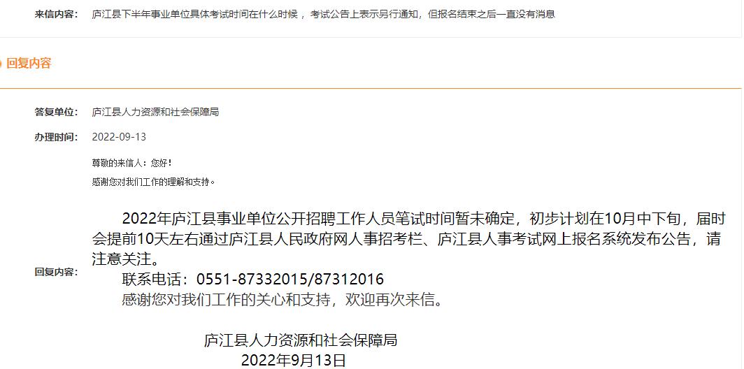 來信標題:2022廬江事業(yè)單位考試時間