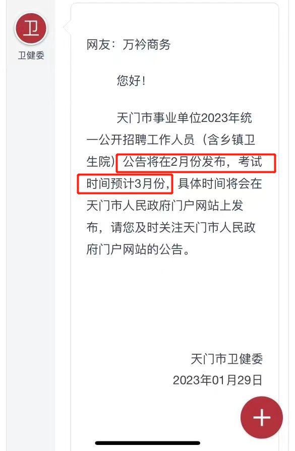 天門(mén)衛(wèi)健委回復(fù):天門(mén)市事業(yè)單位2023年統(tǒng)一公開(kāi)招聘工作人員(含鄉(xiāng)鎮(zhèn)衛(wèi)生院)公告將在2月份發(fā)布,考試時(shí)間預(yù)計(jì)3月份……