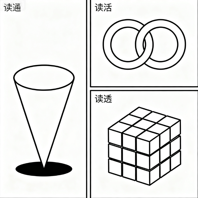 第四題、漫畫(huà)題,三個(gè)圖片,一個(gè)圖片是倒著的圓錐,一個(gè)是兩個(gè)扣住的圓圈,一個(gè)是一堆小正方體組成了一個(gè)大正方體,三個(gè)圖片代表著對(duì)讀書(shū)的不同方式,談?wù)勀銓?duì)讀書(shū)讀通,讀活、讀透的看法。