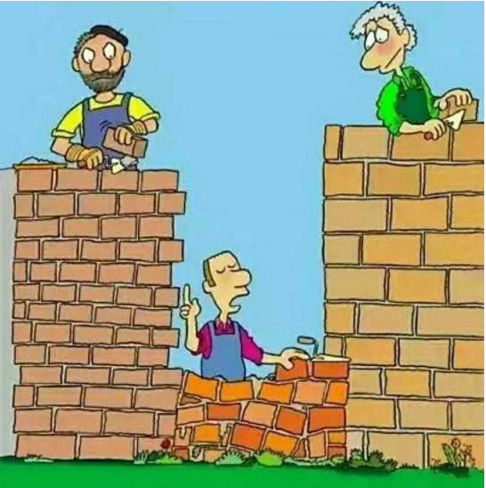 1、漫畫題:三個人砌墻,旁邊兩個人都砌得很高了,中間一個很少,而且磚歪歪斜斜的。三個人用了大小不同的磚塊。