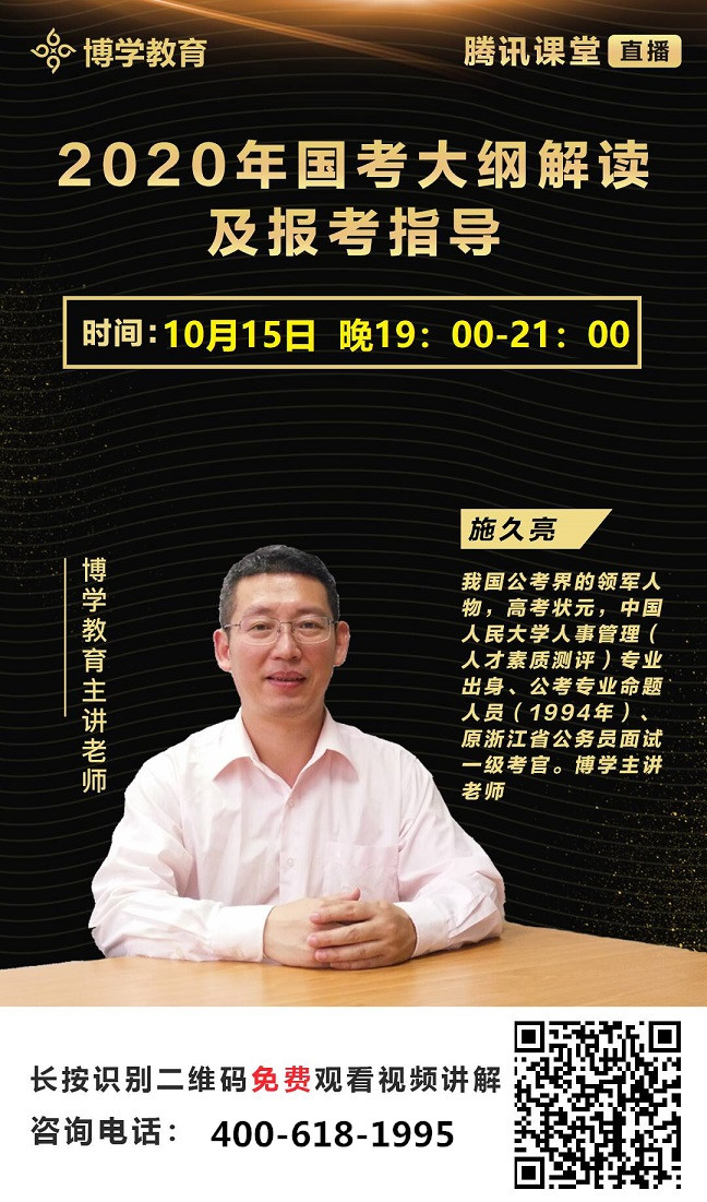 為了提高報名和備考的針對性和有效性,請鎖定10月15、16日晚19:00博學(xué)教育首席老師——施久亮老師2020國考報名指導(dǎo)及大綱解讀的騰訊直播課!你想知道的統(tǒng)統(tǒng)都會有,還可以實時互動!